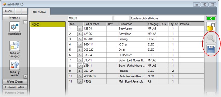So, looking at the example in the picture above, you can see that Item #9 (Part Number 752-124) has a Qty of 2. This means that each assembly needs a quantity of 2. If you were to create a Work Order to build 10 assemblies then, when you 'Issue' that work order then MiniMRP will take a quantity of 20 of that item from your inventory.
