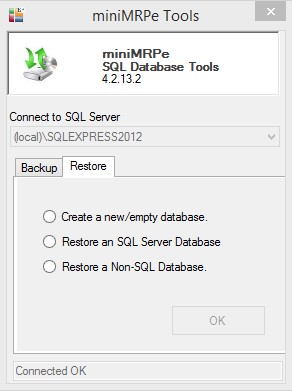 Note: If you have never used miniMrp then you do not need to make a backup before continuing below. A backup is only required if you have data that you wish to migrate - The optional sql restore tool can create a new empty database on your instance of SQL Server or restore non-sql database into sql server.
