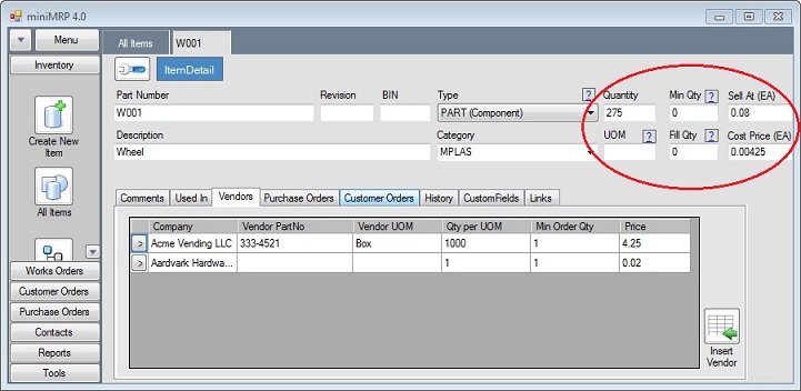 Cost Price - You can not edit the cost price via this box - If this item is a component then you will edit the vendor prices etc via the vendors tab shown in the lower section of the window. You can have any number of vendors with different prices and supply criteria and one of those vendors would be your 'default'. It's the default vendor's price which appears in this box and it's this price that is used when miniMrp calculates costings for assemblies and Bills Of Material. In our picture above notice the relationship between the Vendor's Qty Per UOM, The Vendor's Price and the actual Cost Price (Each) shown in the upper right corner of the window.