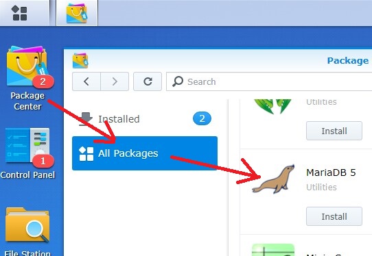 This page shows how to setup a Synology Diskstation/NAS as your MariaDB Database Server. In our example we're using the Synology DS118. Older devices may have different setup options, menu layout etc. Step #1. Installing MariaDB Server on Synology DiskstationFirst thing to do is look to see if MariaDB Server is already installed on your NAS device. Login to your Synology/DSM desktop. Select "Package Center > Installed". This brings up a window showing all packages installed on your NAS. Look to see if MariaDB is already installed.