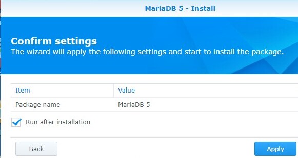 If you go back and look in the "Package Center > Installed Packages" you should now see MariaDB is installed. You shouldn't ever need to 'run' or start MariaDB. Once it's installed it will always run in the background as soon as your NAS is switched on.