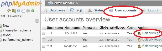 Start phpMyAdmin, if it's not already running, and login using an account with admin permission such as the user/password you created during the installation of MariaDB. Select the "User accounts" tab and click "Edit privileges".