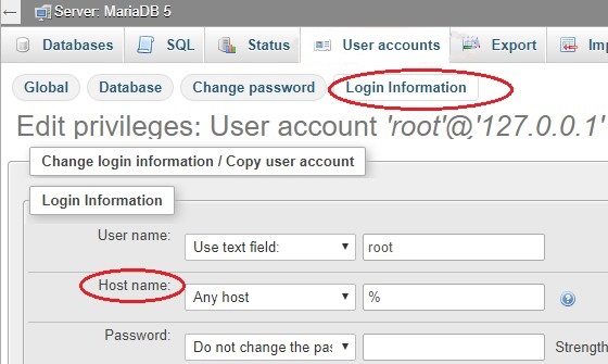 More options, including "Login Information", appear. Note: Older versions of phpMyAdmin might not have the "Login Information" button as shown on the picture below. Some older versions just have all options stacked on a much longer page directly below the User Accounts tab and you'll need to scroll down the page looking for the "Host Name" option)