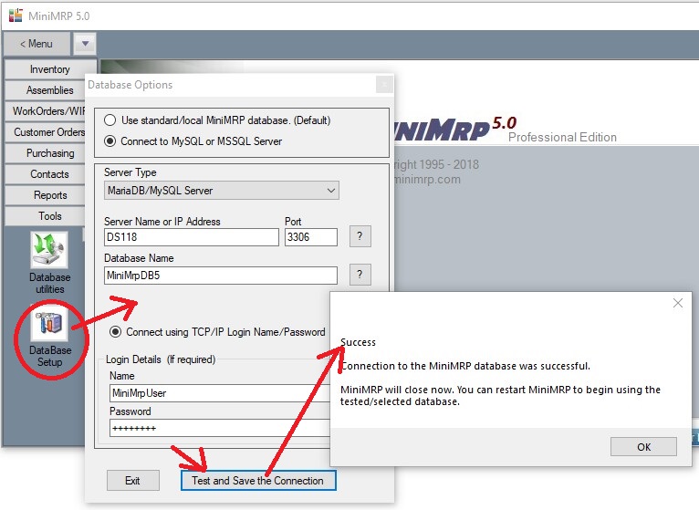 Setting up the MiniMRP program to connect to MariaDB/MySQL.This stage assumes you have a MariaDB/MySQL user account/login to connect to your MariaDB/MySQL Database/Server. If you do not then you should go back to the Server Setup and set things up at the server before continuing with the MiniMRP setup. When you start MiniMRP for the very first time it will be using its own local 'built in' database. This next stage explains how to 'point' MiniMRP at your Synology Diskstation instead. Go to the very bottom of the menu on the left of the MiniMRP program window and select the option "Database Setup". If you don't see that option you'll need make sure you have the 'Professional Edition' of MiniMRP. (standard/personal editions can not connect to MariaDB/MySql servers)