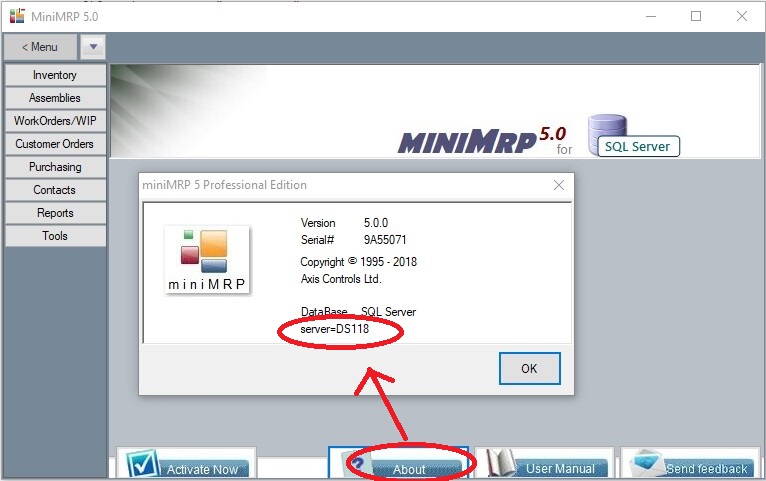 At the very top of the setup window select the option "Connect to MySQL or MSSQL Server" Next is 'Server Type'. MiniMrp can connect to Microsoft SQL Server or MariaDB/MySQL Servers. Change the 'Server Type' to 'MariaDB/MySql Server'. Fill in the remaining options for Server Name, Database Name, User Name and Password. In our example the Synology NAS device is on our local network and is reachable using just the device name "DS118". In your case, depending on your NAS device, you may need to use the device's IP address instead. Click the 'Test and Save' button. If you've set everything up correctly you'll see the 'Success' message. If you see an error message instead then check your settings and try again. If necessary go back to Server Setup Remember, with MariaDB and MySQL user names etc. can be case sensitive so make sure your connection details are correct. Once setup correctly the setup window will close and you can restart MiniMRP. Click the "About" button to confirm you've connected to your NAS device.