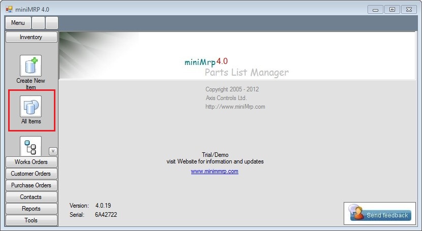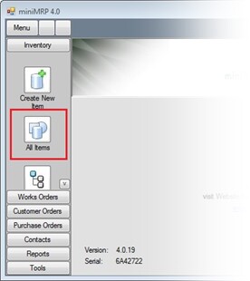 The first thing you notice when you start using miniMrp is the 'Outlook' style menu to the left of the program window. Using this menu you can get to any part of the minimrp program with just 2 or 3 mouse clicks.